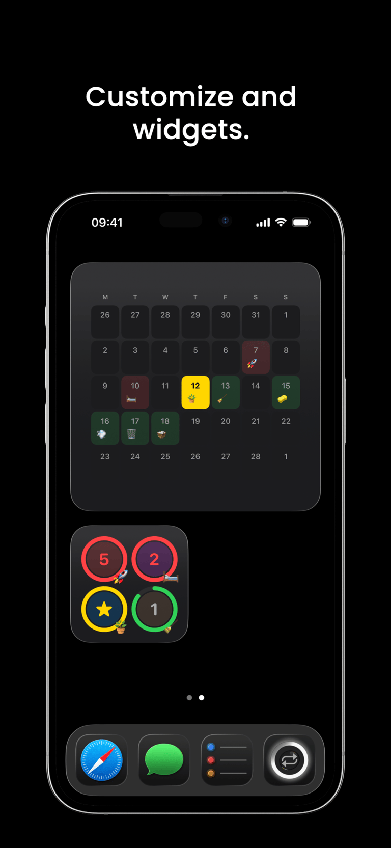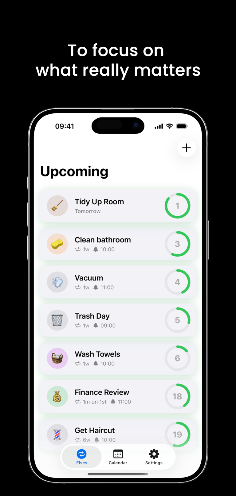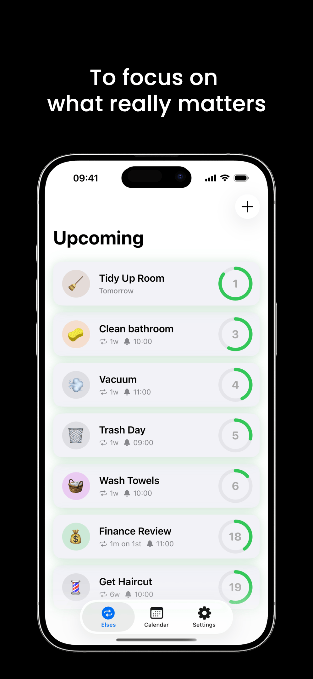 Unlike calendar entries, Elses don't create pressure. Tasks reschedule flexibly upon completion—based on days, weeks, or years. Keep track of everything right from your Home Screen with interactive widgets.